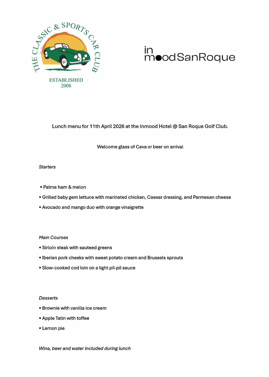 Hello everyone, the April run will finish in the fabulous Hotel Inmood in san Roque, the Menu is in the gallery at the bottom of the page.